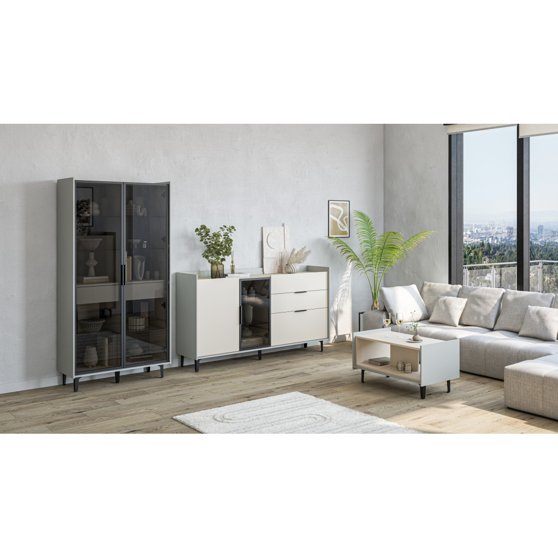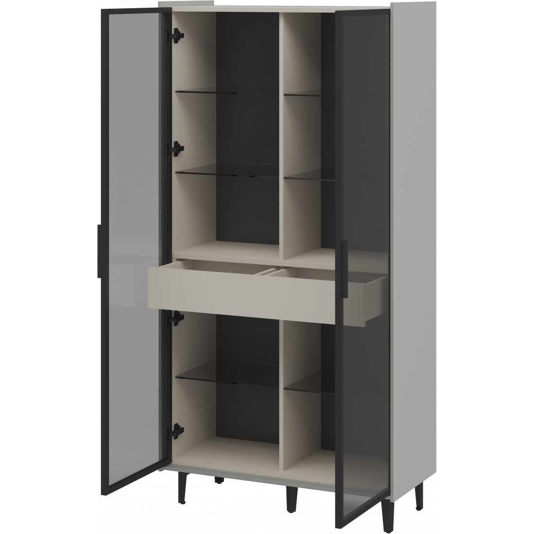 Элегантный шкаф Модена создает изысканную атмосферу в вашей гостиной. Предлагается в трех стильных вариантах цветов: Белый-Дуб Элисон, Лунный камень-жемчуг, Металл Бруклин-лунный жемчуг. Ножки из металла обеспечивают прочную поддержку. Темное стекло добавляет утонченности дизайну. Шкаф оснащен двумя отделениями с элегантными стеклянными полками и фасадами, между которыми находится большой ящик для удобного хранения. Идеальное решение для организации пространства в вашей гостиной